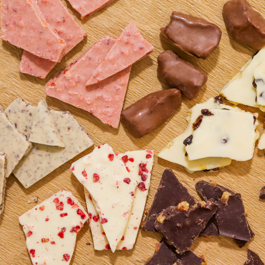 袋を開けた瞬間、丁寧に作り込んだ素材の香りがふわりと広がります。自慢のチョコレートと混ぜ合わせた素材は、味だけでなく大きさや食感にもこだわりました。チョコレートの甘さと素材のバランスが、癖になるスイーツです。