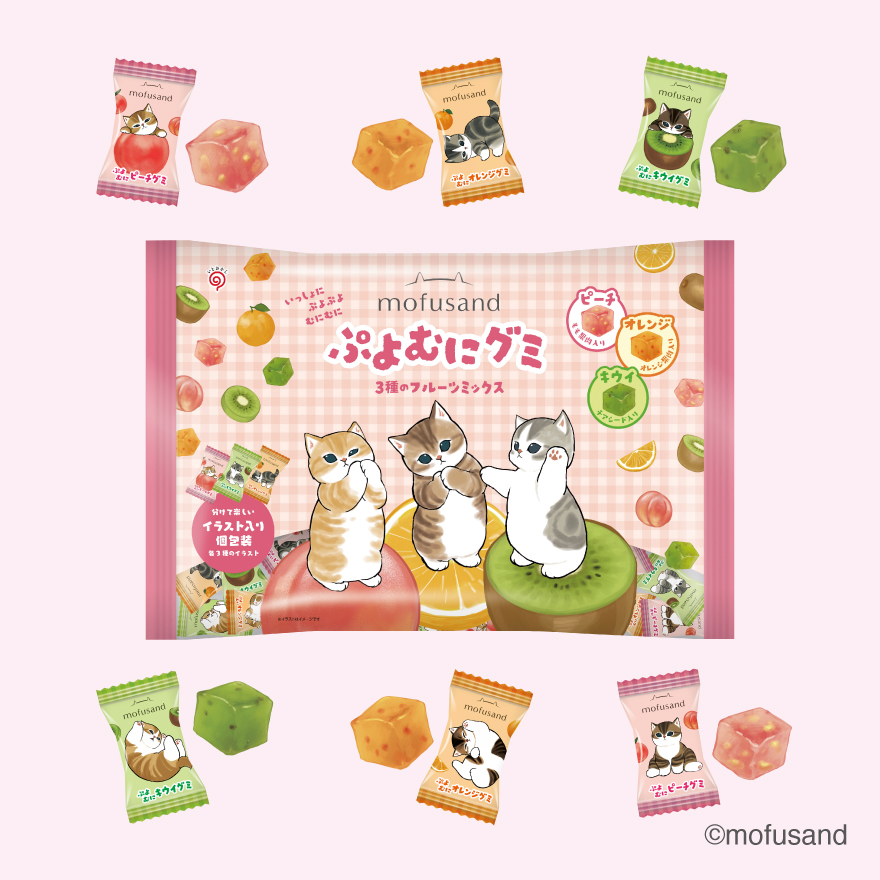 もふもふでキュートで、ちょっとシュールな「mofusand」のにゃんこたちのぷよっ、むにっ、としたピーチ果肉入りピーチ風味グミ。